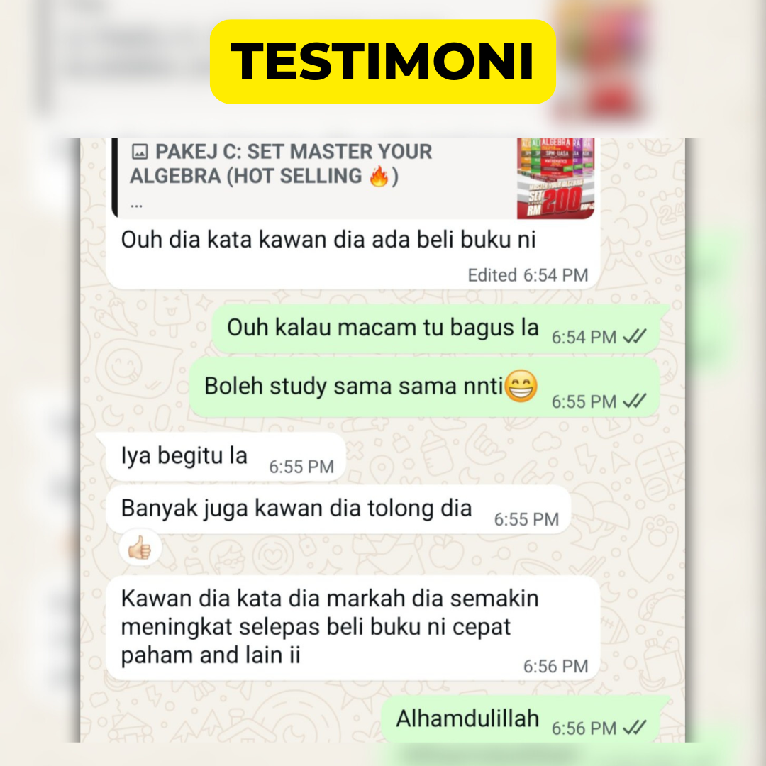 Buku Supermath Algebra dan Master Your Algebra ini ibarat “IQRA” yang mana anak kita kena khatam dulu sebelum baca Al-Quran. Itu contoh yang mudah kami boleh bagi. Bila anak kita sudah kuasai 100% kemahiran Algebra, barulah ibu ayah bagi mereka fokus buat latihan silibus Matematik.